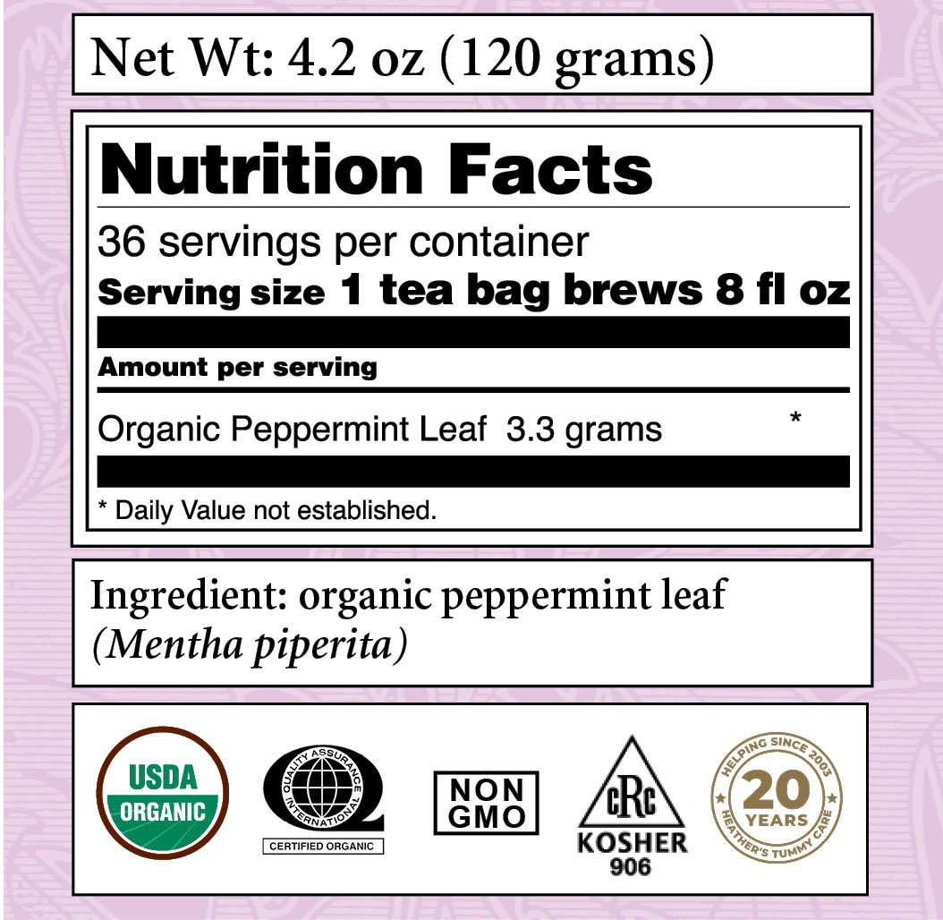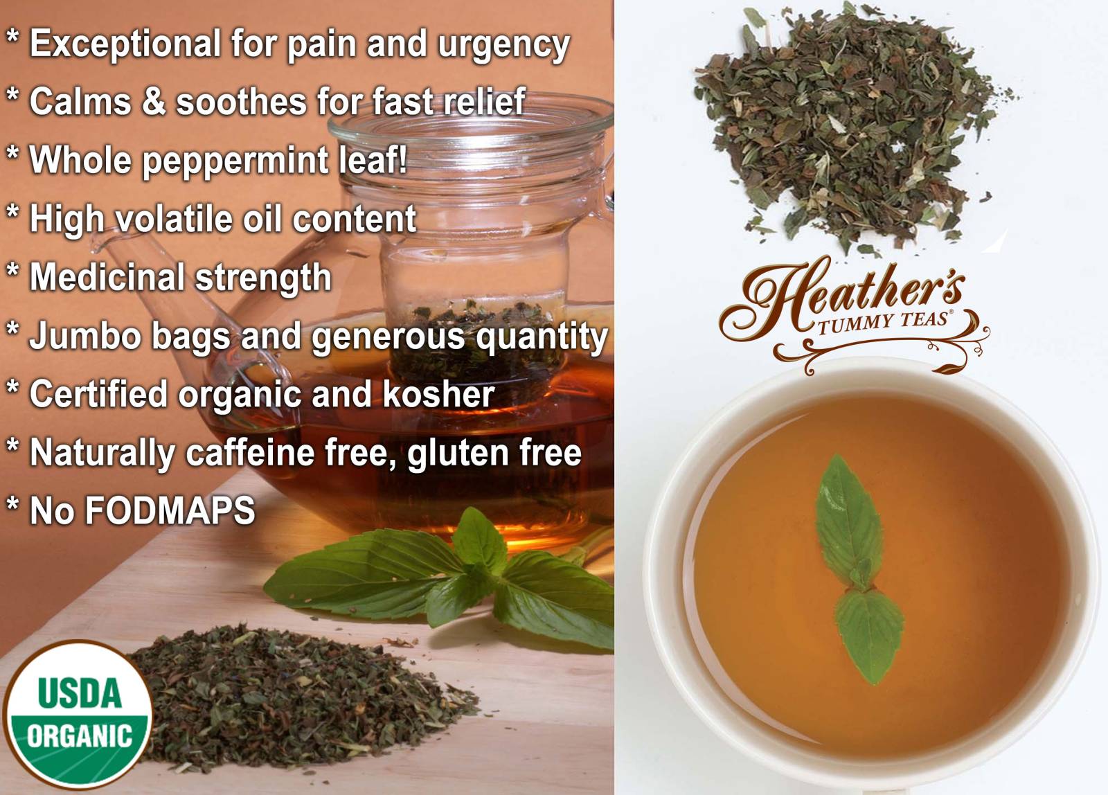 Peppermint tea is extremely useful for IBS cramps and relieving painful abdominal spasms. Peppermint is anti-bacterial, increases gastric juices, and helps relieves gas and nausea. Peppermint also contains essential oils that stimulate the gallbladder to secrete its store of bile, which the body uses to digest fats. This makes Heather's Tummy Tea ~ Organic Peppermint a wonderful digestive aid for heavy meals. It also improves the function of the muscles that line the stomach and intestines, relieves diarrhea (it will not cause or worsen constipation), and has a calming, numbing effect on the entire GI tract.